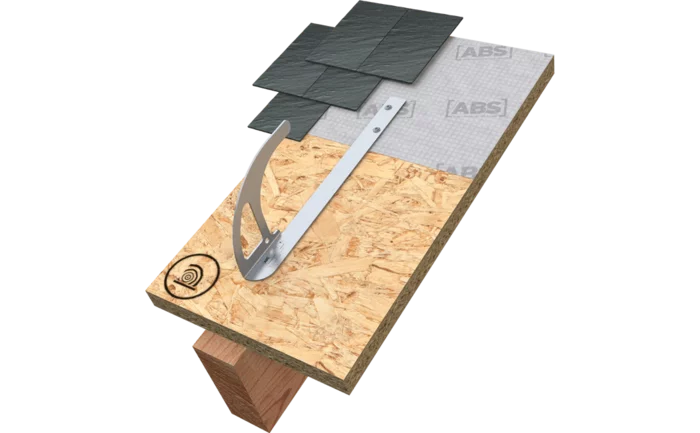 Sikkerhedstagkrogen af rustfrit stål med flad skinne til gennemgående forskalling i træspær. De 2 medfølgende skruer i rustfrit stål skrues fast i kontralægter/forskalling i spærene. Montage i tagspærisolering er muligt med valgfrie specialskruer.