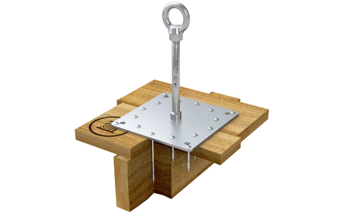 Fastgøres med 2 lange skruer i bjælker og 14 yderligere skruer direkte på træforskallingen | hvorefter ankerpunktet (Ø 16 mm) i rustfrit stål med grundplade (200 x 200 mm) sikrer tagarbejder & Co. imod fald. Inkl. generel bygningstilsyns godkendelse fra DIBt.