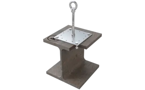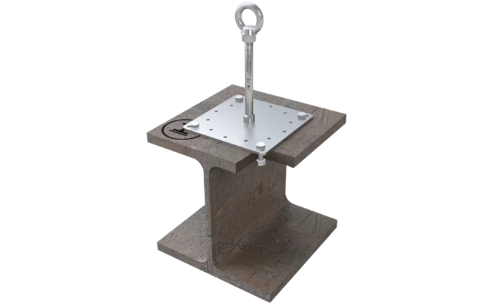 Fastgør grundpladen (200 x 200 mm) til dette ankerpunkt (Ø 16 mm) i rustfrit stål med 4 skruer | ligeledes af rustfrit stål | igennem bærende stålunderlag. Fastgørelsesanordningen er byggetilsyns tilladt af DIBt. De nødvendige skruer og møtrikker medfølger ved levering.