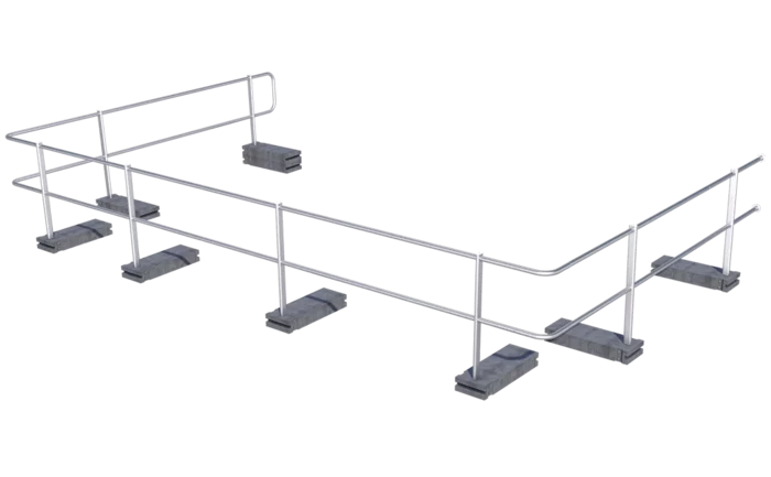 Du kan sikre dine nedfaldskanter på taget | lyskupler og andre områder med nedfaldsfare på flade tage (til en hældning på 10°) med dette gelænder. Det 1100 mm store beskyttelsesgelænder er fremstillet af førsteklasses aluminium og rustfrit stål. Installering med vægte uden at lave huller.